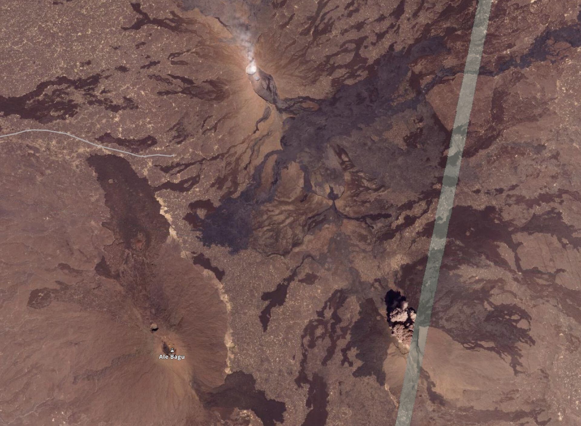 Very early moments of the Hayli Gubbi eruption on November 23,2025. The steaming lava lake at Erta Ale can be seen in the top of the image. Credit Planet (via Simon Carn).